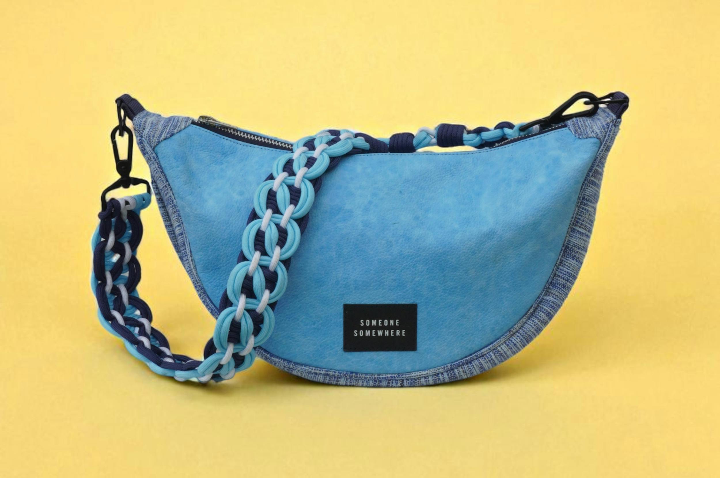 The bag combines three techniques that represent different ways of creating. The upper section, made with Celium™ in a baby blue tone, reflects the aesthetics of bacterial growth and design. The lower section, made from CircuLoom, Someone Somewhere’s textile innovation created entirely from recycled threads and woven on a pedal loom, showcases resourcefulness and cultural continuity. Its strap, hand-knotted in macramé, embodies patience and the artistry of human touch.